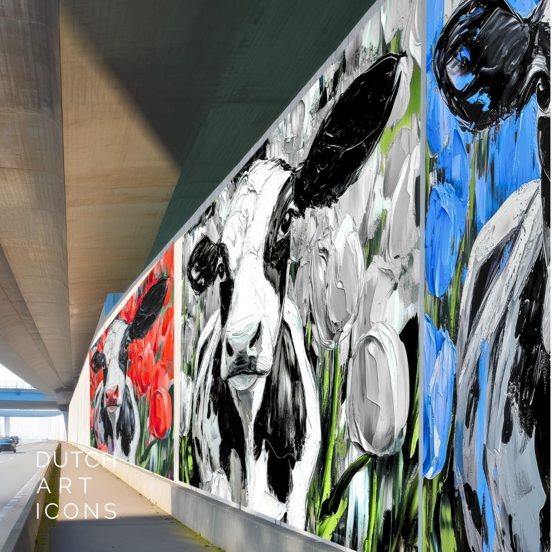 Typisch Nederlandse iconen als tulpen, koeien, Delfts Blauw, molens en grachtenpanden met een kleurrijke eigentijdse uitstraling. Deze Hollandse meesterstukken zijn aansprekend, vrolijk en inspirerend.