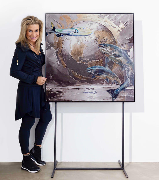 In het artwork het cargo toestel van K+N en de zalmen van Mowi voor een abstracte wereldbol in de achtergrond.