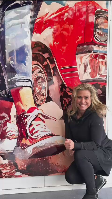 De particuliere opdrachtgever van deze Artworks stuurde een foto van de wand in zijn nieuwe huis en enkele impressies van zijn persoonlijke aandachtgebieden, waaronder oude Chevy’s, James Dean en Harley Davidson.